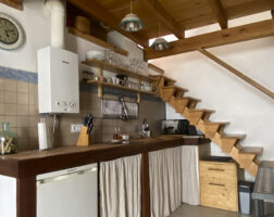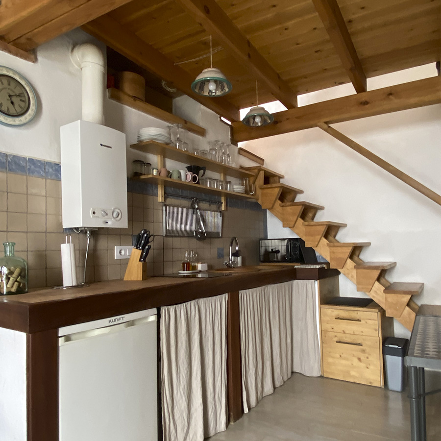 Nevera baja con congelador, menaje completo, microondas, tostador, batidora, cafetera italiana, vitrocerámica de 2 fuegos, lavadora-secadora y mesa de comedor con banco y 2 sillas. Aceite, vinagre, sal y pimienta.