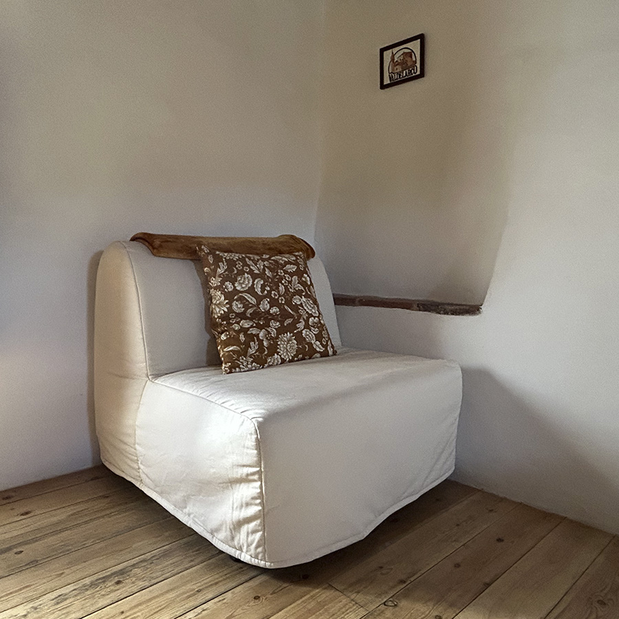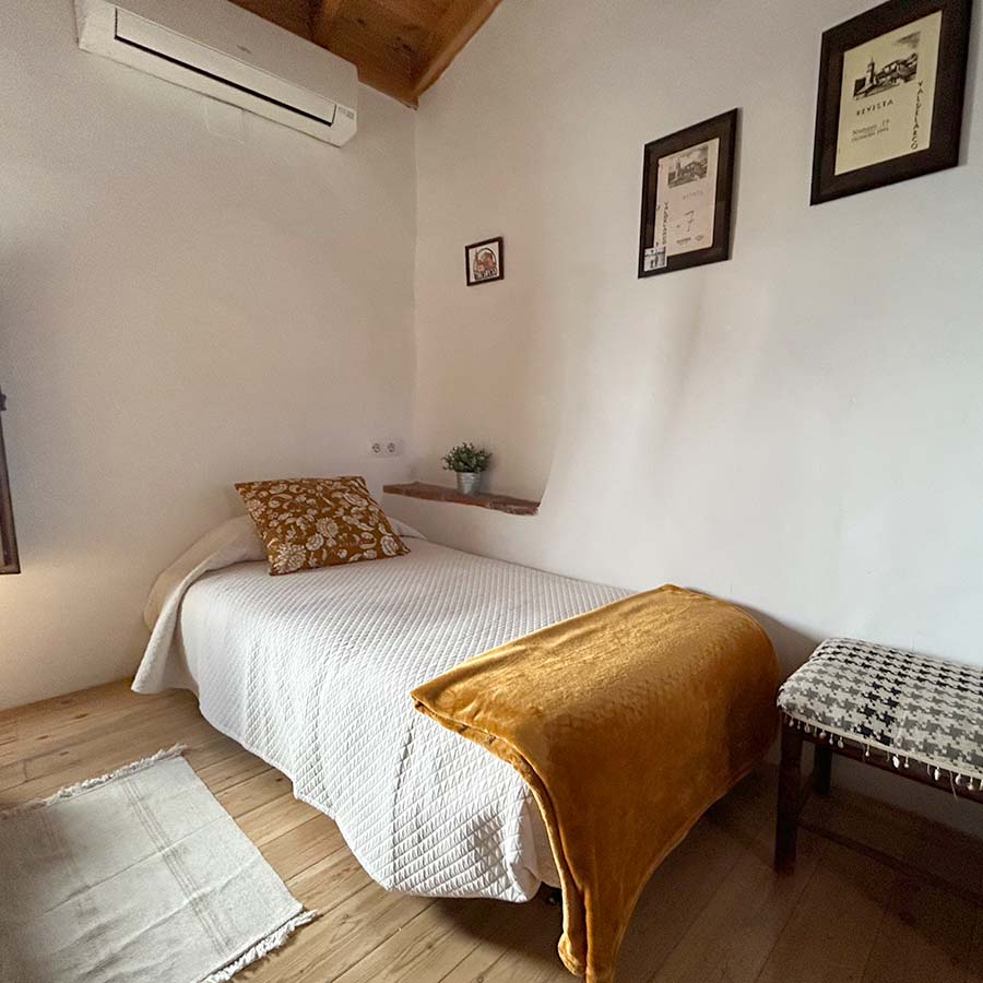 Suelo y techo de madera, cama de matrimonio de 150cm, cama supletoria de 80cm, aire acondicionado con bomba de calor, ventilador (en temporada), armario, Smart TV con Prime Video, plancha y tabla de planchar, sábanas y edredón nórdico.