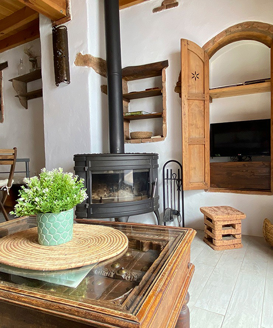 Smart TV con Prime Video, wifi, chimenea de leña, mesa baja y sofá.